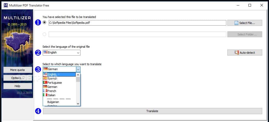 هناك برنامج مجاني لترجمة الملفات علي الويندوز يمكنك تحميلة من خلال الرابط الموجود بالاسفل والبرنامج بسيط للغاية ولكنه ليس مجاني تماما فهو يقوم بترجمة 15 صفحة فقط للنسخة التجريبية ويمكنك الترقية لشراء نسخة مدفوعة من البرنامج والتي بأسم pdf translator pro.